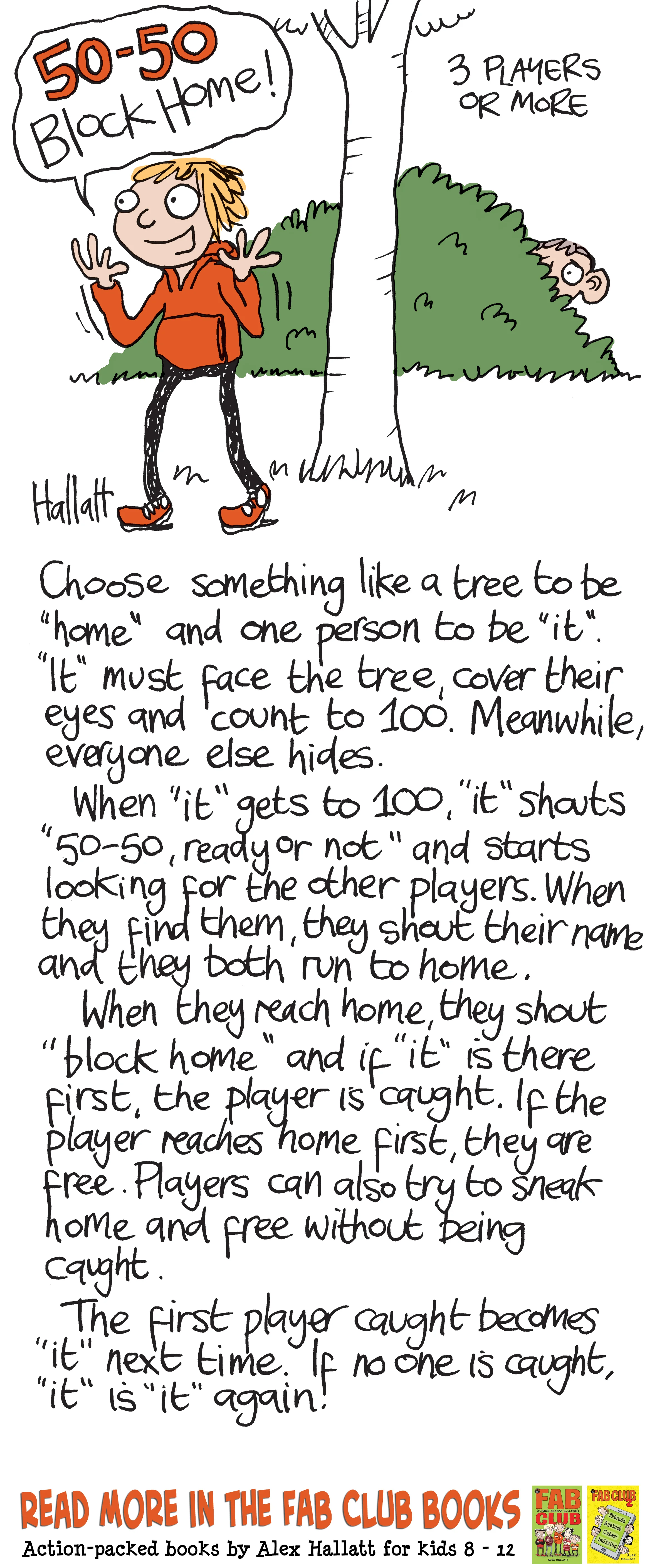 50-50 Block home rules. 3 players or more.Choose something like a tree to be home and one person to be “it”. “It” must face the tree cover their eyes and count to 100. Meanwhile, everyone else hides. When it gets to 100, it shouts “50-50, ready or not” and starts looking for the other players. When they find them, they shout their name and they both run to home. When they reach home they shout “block home” and if “it” is there first the player's caught. If the player reaches home first they are free. Players can also try to sneak home and free without being caught. The first player caught becomes “it” next time. If no one 's caught “it” is “it” again.